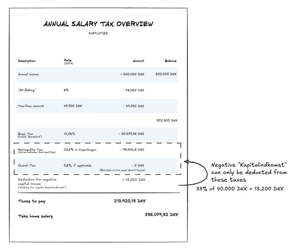 - Kapitalindkomst (Capital Income): If your total Kapitalindkomst is negative, it can be deducted from your municipal and church taxes, For the first 50.000 DKK you lose, you can reduce your local and church taxes by 33% of that amount. If you lose more than 50.000 DKK, you can reduce your taxes by 25% of the extra amount. Negative Kapitalindkomst will show up on your annual tax report (Årsopgørelsen) as "Nedslag for negativ kapitalindkomst".